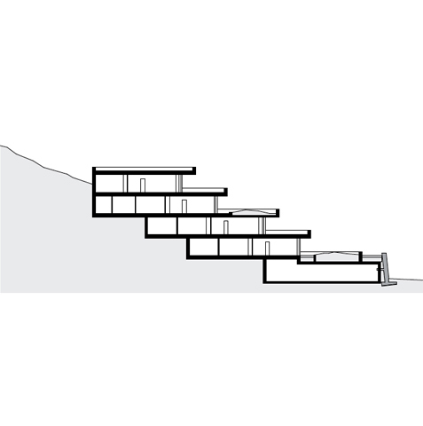 Le projet tend à exploiter au mieux le fort potentiel de la situation tout en limitant l´impact du bâti sur le site. Une implantation en terrasses est retenue afin de travailler avec la topographie naturelle du terrain et permettant de fragmenter les volumes en les étalant dans la pente.